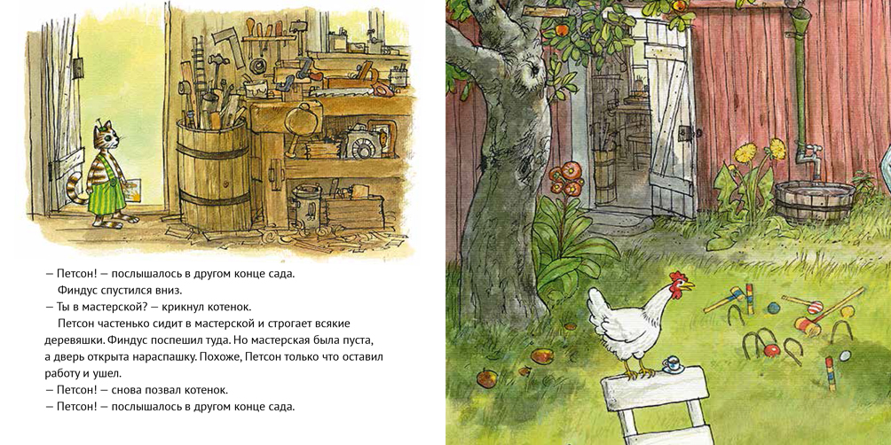 Эта короткая, добрая и простая история научит малышей не бояться, если взрослый ненадолго исчезнет из виду, а иллюстрации Свена Нурдквиста — как всегда блестящие и полные интересных подробностей — обратят внимание маленьких читателей не только на самих героев, но и на искренние и забавные мелочи, которые автор так любит изображать во всех своих книгах.